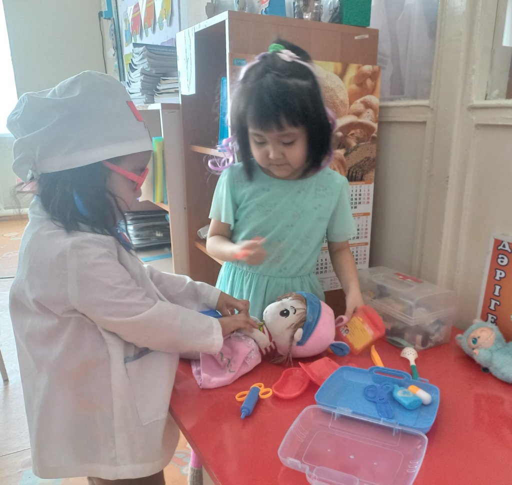 Мақсатты: Әлеуметтік- ойын тәжірибесін байыту, балалардың дәрігер , медбикелер мамандықтар, туралы түсініктерін кеңейту, адамдарға деген қамқорлық таныту.