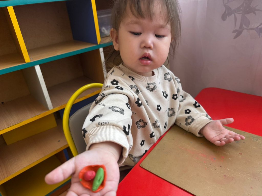 Міндеті:Балаларға арналған ермексазбен тұтас бір бөлігін алақанда дөңгелектеп илеу техникасын игерту; қолдың ұсақ моторикасын,танымы мен зейінін дамыту.