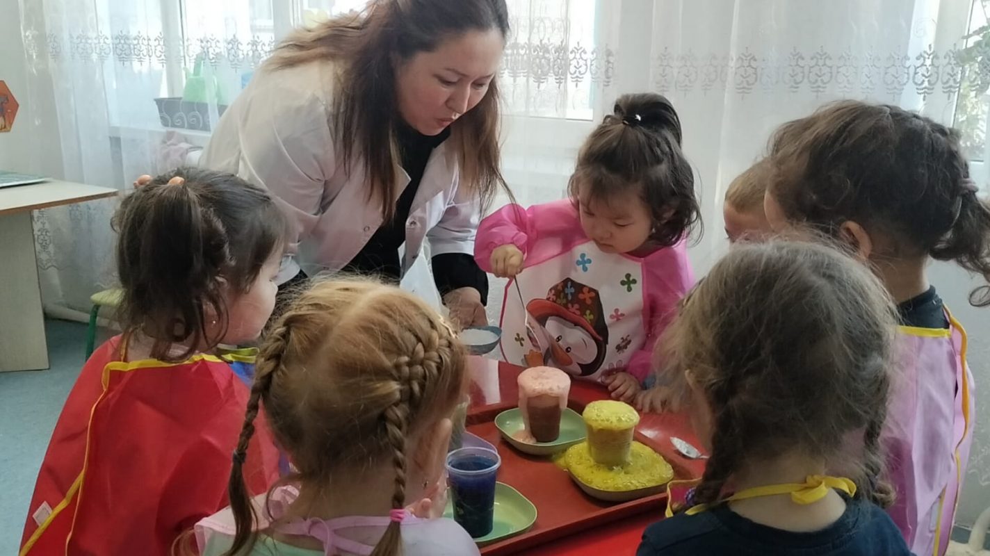 Зертханалық тәжірибе: «Түрлі -түсті көпіршіктердің ғажайып әлемі» Мақсаты: Балаларға химиялық реакциядан газ(көмірқышқыл газы) бөлініп, сабын көпіршігін тудыру процесін көрсету.Сонымен қатар түстерді бақылау.