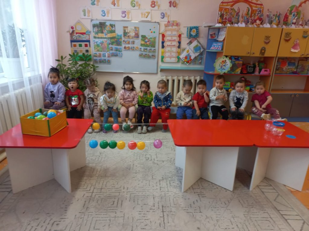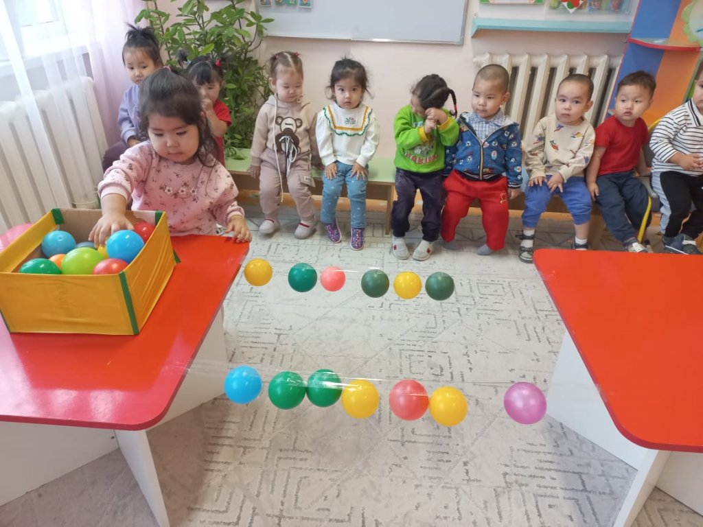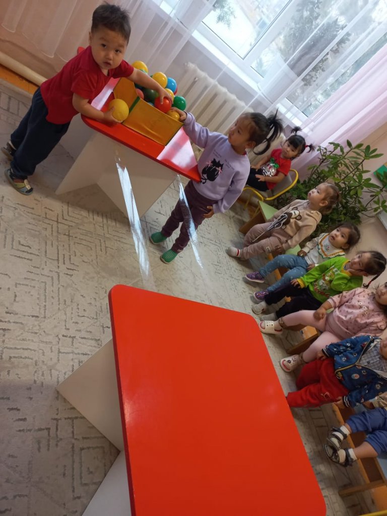 "Ақбота"кіші тобы Тақырыбы:"Түстерді ойын арқылы үйрену." Мақсаты:Ұсақ қол моторикасын жетілдіру. Тапсырмаларды өзіндік орындауға тәрбиелеу. Баланың негізгі түстерді (қызыл, сары, жасыл, көк,және т.б). Тәрбиеші:Кабдуллина Б.Б