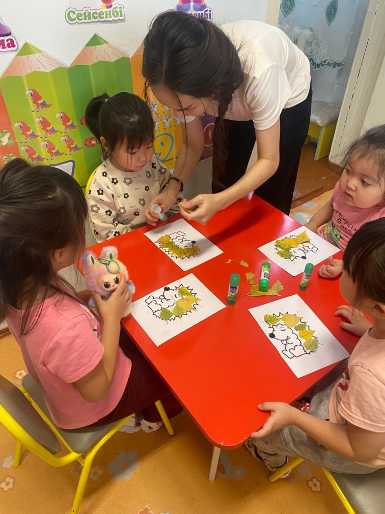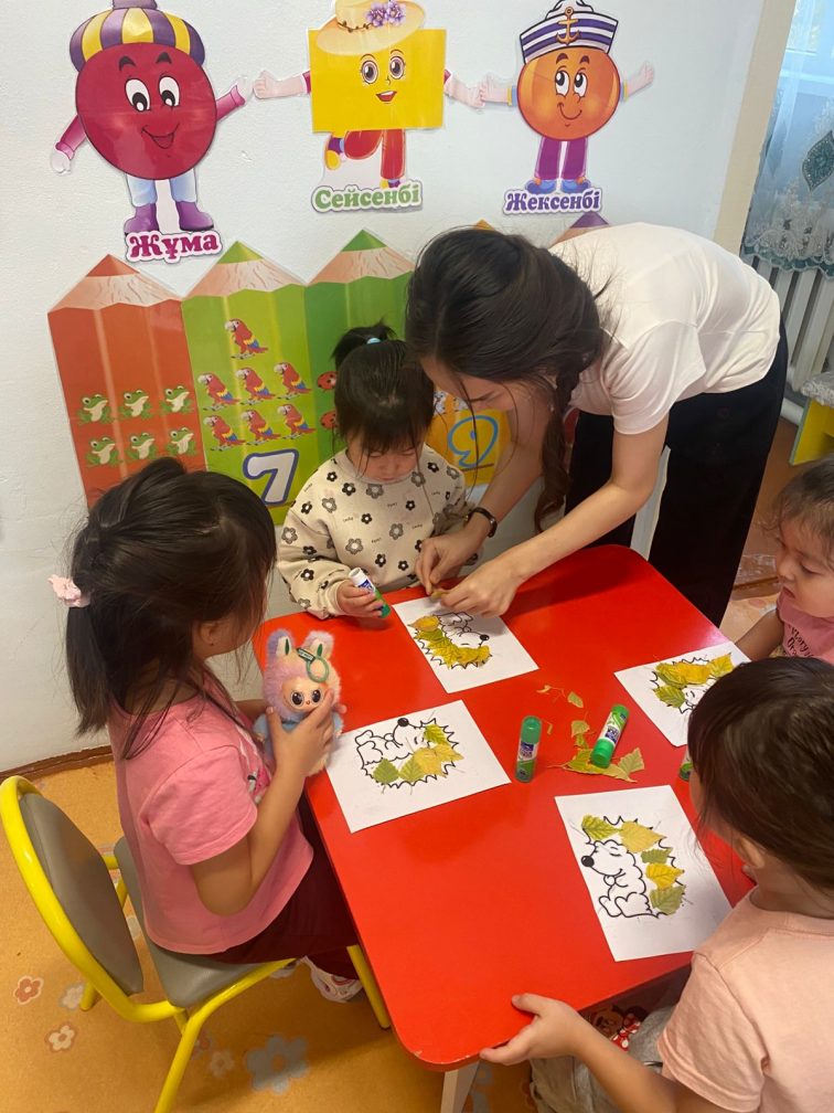 Мақсаты: баларды жабыстыруға уйрету , ұсақ маториканы дамыту Бүгін “Қоңырау тобы” жапырақтармен желімнін көмегімен күзгі бақты бейнеледі