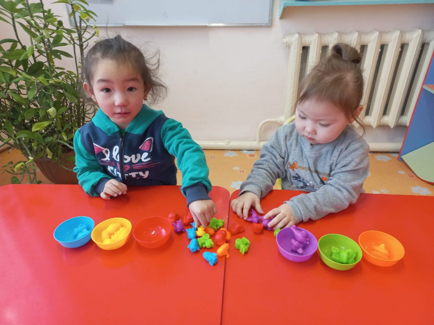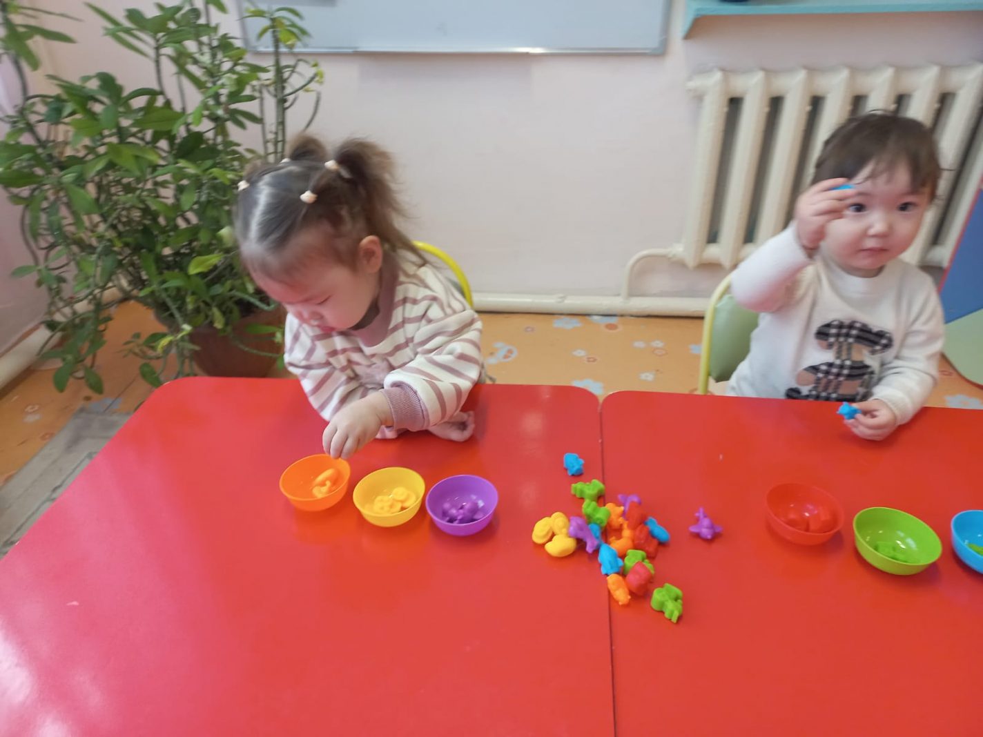 Тема:Раскладывание игрушек по контейнерам в соответствии с их цветом. Цель:Научить детей сортировать игрушки по цвету и раскладывать их по соответствующим контейнерам.
