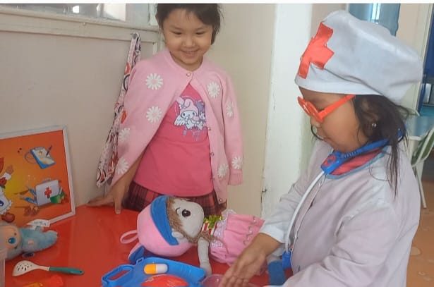 Сюжеттік- рөлдік ойын "Дәрігерде" Мақсатты: Әлеуметтік- ойын тәжірибесін байыту, балалардың дәрігер , медбикелер мамандықтар, туралы түсініктерін кеңейту, адамдарға деген қамқорлық таныту.