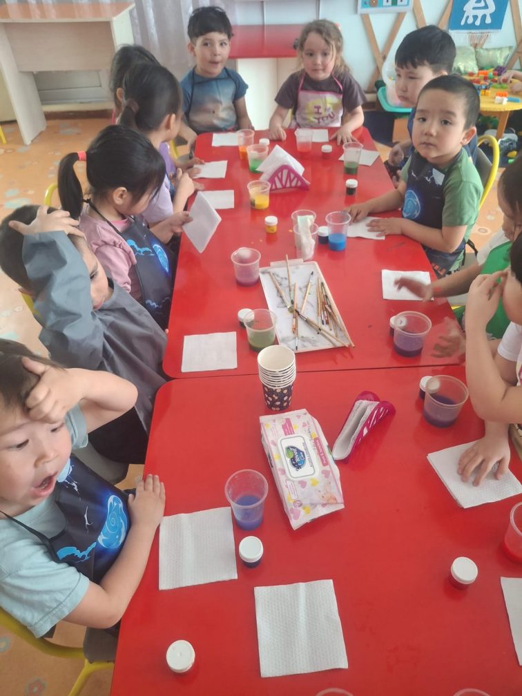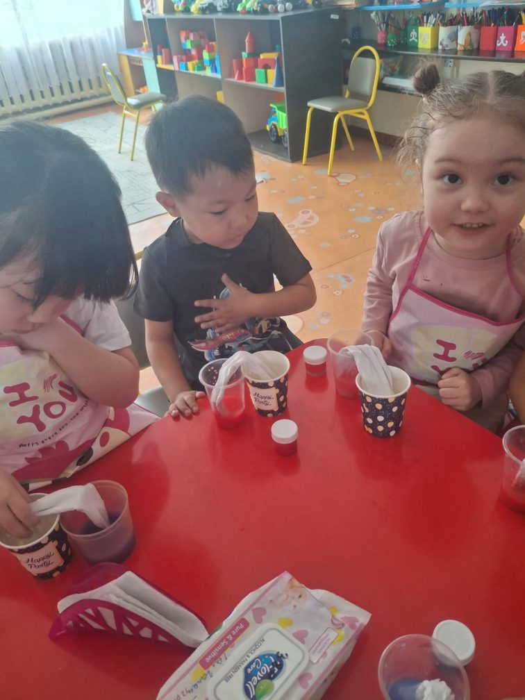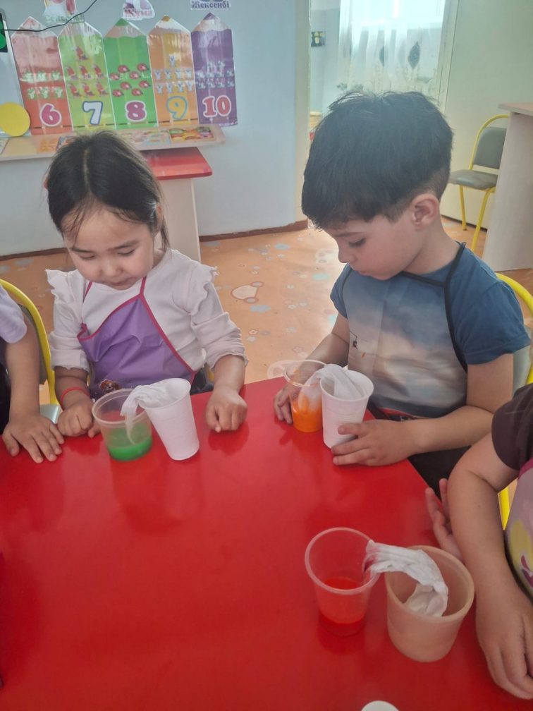 «Қоңырау» тобында «Судың қасиеттері» тақырыбында тәжірибелік ұйымдастырылған іс-әрекеті өткізілді. Мақсаты: Судың мөлдір сұйықтық екенін, онда бояғыштар еріген кезде боялатынын көрсету.Судың қозғала алатынын көрсету. Оқушыларды судағы өзгерістерді байқай білуге үйрету.